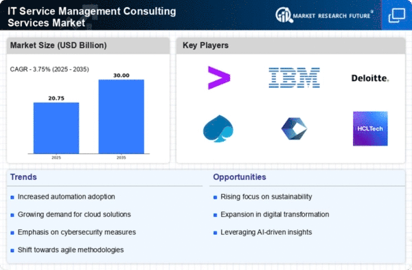 The IT Service Management Consulting Services Market is experiencing a notable surge in demand driven by organizations' need for digital transformation. As businesses increasingly adopt digital technologies, the requirement for effective IT service management becomes paramount. According to recent data, the market for IT service management is projected to grow at a compound annual growth rate of approximately 10% over the next few years. This growth is largely attributed to the necessity for organizations to streamline operations, enhance customer experiences, and improve service delivery. Consequently, IT service management consulting services are becoming essential for organizations aiming to navigate the complexities of digital transformation successfully.