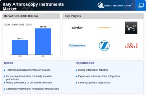 The rising incidence of orthopedic disorders in Italy is a crucial driver for the Italy Arthroscopy Instruments Market. Conditions such as osteoarthritis and sports-related injuries are becoming more common, leading to a higher demand for arthroscopic surgeries. According to recent data, approximately 30% of the Italian population over the age of 65 suffers from some form of arthritis, necessitating effective treatment options. This trend is likely to propel the market for arthroscopy instruments, as healthcare providers seek advanced tools to perform these procedures efficiently. Furthermore, the Italian healthcare system is increasingly adopting arthroscopic techniques due to their benefits, such as reduced recovery times and improved patient outcomes. As a result, the market for arthroscopy instruments is expected to expand significantly in response to the growing need for orthopedic interventions.