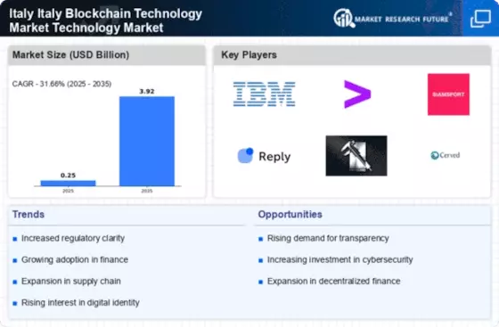 The Italy Blockchain Technology Market Technology Market is experiencing a surge in demand for enhanced security and transparency across various sectors. Blockchain technology offers immutable records, which are particularly appealing to industries such as finance, supply chain, and healthcare. In Italy, the implementation of blockchain solutions has been noted to reduce fraud and increase trust among stakeholders. For instance, the Italian government has initiated projects to utilize blockchain for public records, thereby ensuring data integrity. This trend is likely to continue as organizations seek to leverage blockchain's capabilities to safeguard sensitive information and improve operational efficiency.