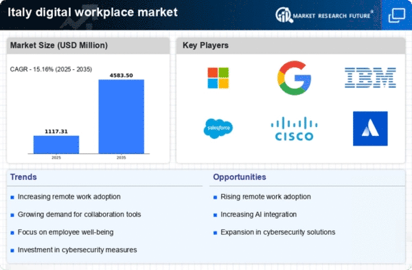 The integration of collaborative technologies is a driving force within the digital workplace market in Italy. As teams become more dispersed, the need for effective collaboration tools intensifies. In 2025, it is anticipated that the market for collaborative software will grow by 15%, reflecting the increasing demand for solutions that facilitate teamwork and communication. This trend is indicative of a broader shift towards a more interconnected work environment, where digital tools play a crucial role in enhancing collaboration. The digital workplace market is responding by developing innovative platforms that support real-time collaboration, thereby enabling organizations to thrive in a competitive landscape.