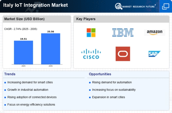 The increasing demand for automation across various sectors in Italy is a pivotal driver for the iot integration market. Industries such as manufacturing, logistics, and agriculture are actively seeking to enhance operational efficiency through automated processes. This trend is reflected in a reported growth of approximately 15% in automation investments in 2025. As businesses strive to reduce costs and improve productivity, the integration of IoT technologies becomes essential. The IoT integration market is thus positioned to benefit from this shift., as companies look to implement smart solutions that facilitate real-time monitoring and control. Furthermore, the Italian government has been promoting initiatives to support automation, which further fuels the growth of the iot integration market in the region.