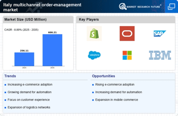 The increasing adoption of e-commerce in Italy is a primary driver for the multichannel order-management market. As consumers increasingly prefer online shopping, businesses are compelled to enhance their order management systems to accommodate this shift. In 2025, e-commerce sales in Italy are projected to reach approximately €50 billion, reflecting a growth rate of around 15% annually. This surge necessitates robust multichannel order-management solutions that can seamlessly integrate various sales channels, ensuring efficient order processing and fulfillment. Companies that invest in advanced order-management systems are likely to gain a competitive edge, as they can respond more effectively to consumer demands and preferences. The multichannel order-management market is thus positioned to expand significantly, driven by the need for businesses to adapt to the evolving retail landscape.
