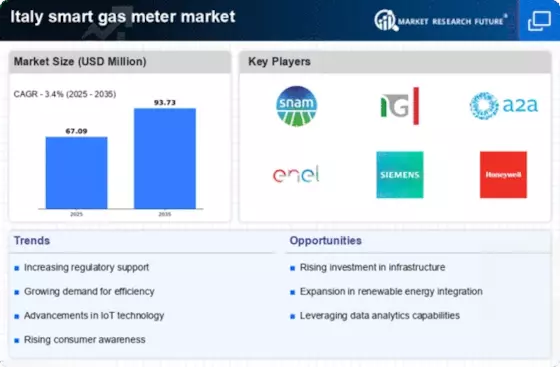 The Italy Smart Gas Meter Market is experiencing a robust push due to regulatory support from the Italian government. The Italian Regulatory Authority for Energy, Networks and Environment (ARERA) has established guidelines that mandate the deployment of smart gas meters across the country. This regulatory framework aims to enhance energy efficiency and reduce greenhouse gas emissions. As of 2025, it is estimated that over 80% of gas consumers in Italy will have transitioned to smart meters, reflecting a significant increase from previous years. This regulatory impetus not only facilitates the adoption of advanced metering infrastructure but also encourages utility companies to invest in innovative technologies. Consequently, the Italy Smart Gas Meter Market is poised for substantial growth, driven by compliance with these regulations and the associated benefits of improved operational efficiency.