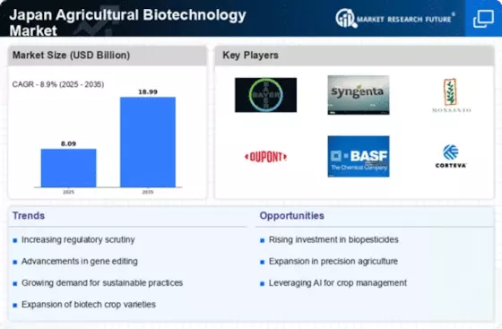 Food security remains a pressing concern in Japan, particularly in light of its aging population and declining arable land. The Japan Agricultural Biotechnology Market is responding to this challenge by developing biotechnological solutions that enhance food production efficiency. In 2025, the government reported that biotechnology could potentially increase crop yields by up to 20%, addressing food supply issues. This focus on food security is likely to propel investments in agricultural biotechnology, as stakeholders recognize the importance of sustainable practices in ensuring a stable food supply for the future.