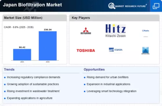 Technological innovations are significantly influencing the Japan Biofiltration Market. Advances in biofiltration technologies, such as the development of more efficient bioreactors and the integration of artificial intelligence for monitoring and optimization, are enhancing the effectiveness of these systems. Japanese companies are at the forefront of these innovations, investing in research to improve the performance of biofiltration solutions. For example, the introduction of hybrid biofiltration systems that combine biological and physical filtration methods has shown promising results in treating complex wastewater streams. This technological progress not only increases the efficiency of biofiltration systems but also reduces operational costs, making them more attractive to industries. As these innovations continue to emerge, they are expected to drive market growth, with an increasing number of sectors adopting biofiltration technologies.