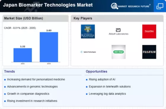 The rising demand for companion diagnostics is a crucial driver for the Japan Biomarker Technologies Market. Companion diagnostics are tests designed to determine the suitability of specific therapies for individual patients, thereby enhancing treatment efficacy. As the pharmaceutical industry increasingly focuses on developing targeted therapies, the need for reliable biomarker tests has surged. In Japan, regulatory bodies are actively promoting the integration of companion diagnostics into clinical workflows, which is expected to streamline the approval process for new drugs. This trend is likely to foster collaboration between diagnostic companies and pharmaceutical firms, further propelling the market. The Japan Biomarker Technologies Market stands to benefit from this synergy, as it aligns with the broader shift towards personalized medicine and patient-centric healthcare.