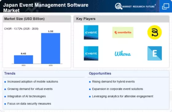 The Japan Event Management Software Market is currently characterized by a dynamic competitive landscape, driven by technological advancements and an increasing demand for seamless event experiences. Key players such as Cvent (US), Eventbrite (US), and Bizzabo (US) are actively shaping the market through strategic initiatives focused on innovation and regional expansion. Cvent (US), for instance, emphasizes its comprehensive suite of solutions that cater to various event types, positioning itself as a leader in the sector. Meanwhile, Eventbrite (US) has been enhancing its platform to facilitate user engagement and streamline ticketing processes, thereby attracting a diverse clientele. Bizzabo (US) appears to be concentrating on integrating advanced analytics into its offerings, which may enhance user experience and operational efficiency, collectively influencing the competitive environment towards a more technology-driven approach.