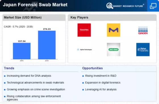 The Japan Forensic Swab Market is characterized by a competitive landscape that is increasingly shaped by innovation and strategic partnerships. Key players such as Thermo Fisher Scientific (US), Merck KGaA (DE), and Qiagen (DE) are actively pursuing strategies that emphasize technological advancements and regional expansion. For instance, Thermo Fisher Scientific (US) has focused on enhancing its product portfolio through continuous innovation, which appears to be a critical driver of its competitive edge. Similarly, Merck KGaA (DE) has been investing in research and development to introduce novel forensic swab solutions, thereby reinforcing its market position. Collectively, these strategies suggest a trend towards a more integrated and technologically advanced market environment.