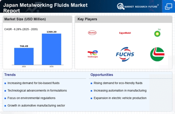 As per Market Research Future analysis, the Japan Metalworking Fluids Market Size was estimated at 700.5 USD Million in 2024. The Japan metalworking fluids market is projected to grow from 744.49 USD Million in 2025 to 1369.2 USD Million by 2035, exhibiting a compound annual growth rate (CAGR) of 6.2% during the forecast period 2025 - 2035