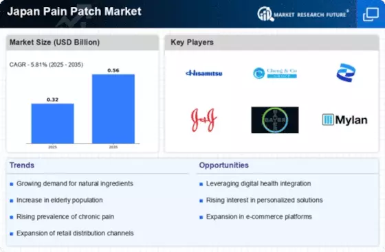The Japan Pain Patch Market exhibits a dynamic competitive landscape characterized by a blend of innovation, strategic partnerships, and regional expansion. Key players such as Hisamitsu Pharmaceutical Co., Inc. (JP), Pfizer Inc. (US), and Johnson & Johnson (US) are at the forefront, each employing distinct strategies to enhance their market presence. Hisamitsu Pharmaceutical Co., Inc. (JP) focuses on innovation in transdermal delivery systems, aiming to improve patient compliance and therapeutic outcomes. Meanwhile, Pfizer Inc. (US) leverages its extensive research capabilities to develop advanced formulations, while Johnson & Johnson (US) emphasizes a diversified product portfolio that caters to various pain management needs. Collectively, these strategies contribute to a competitive environment that is increasingly driven by technological advancements and consumer-centric approaches.