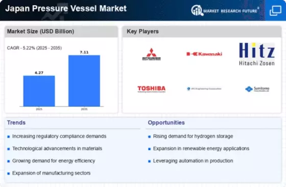 The Japan Pressure Vessel Market is significantly influenced by stringent regulatory compliance and safety standards. The Japanese government has established comprehensive regulations to ensure the safety and reliability of pressure vessels, particularly in industries such as oil and gas, chemical processing, and power generation. These regulations mandate regular inspections, maintenance, and certification of pressure vessels, which drives demand for high-quality manufacturing and innovative design solutions. As of 2025, the market is projected to grow at a compound annual growth rate (CAGR) of approximately 4.5%, largely due to the increasing emphasis on safety and compliance. Companies that adhere to these regulations not only enhance their market reputation but also gain a competitive edge in the Japan Pressure Vessel Market.