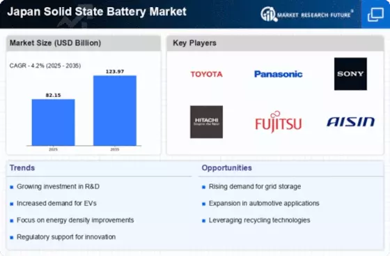 Technological advancements in battery manufacturing processes are significantly influencing the Japan Solid State Battery Market. Innovations such as the development of new solid electrolytes and improved manufacturing techniques are enhancing the performance and reducing the costs of solid-state batteries. Companies are investing heavily in automation and precision engineering to streamline production, which could lead to economies of scale. For example, major Japanese manufacturers are collaborating with research institutions to refine these technologies, aiming to bring high-performance solid-state batteries to market by the late 2020s. This trend suggests a promising future for the industry, as enhanced manufacturing capabilities may lead to wider adoption across various applications.