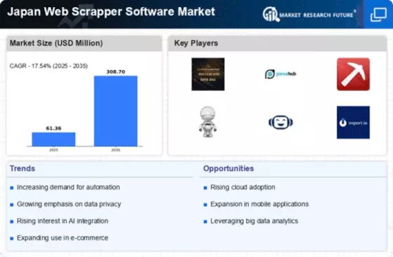 Technological advancements are playing a pivotal role in the evolution of the Japan Web Scrapper Software Market Industry. Innovations such as artificial intelligence and machine learning are being integrated into web scraping tools, enabling more efficient data extraction and analysis. These advancements allow users to automate complex scraping tasks, thereby reducing the time and resources required for data collection. Furthermore, the introduction of cloud-based solutions is enhancing accessibility and scalability for businesses of all sizes. As organizations in Japan increasingly adopt these advanced technologies, the demand for sophisticated web scraping software is expected to rise, potentially leading to a more competitive market landscape.