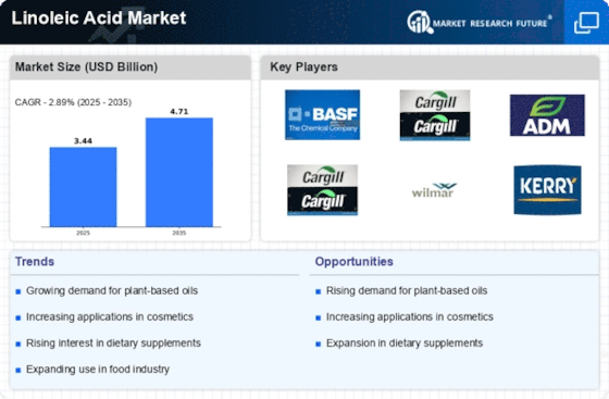The Linoleic Acid Market is experiencing a notable surge in demand for functional foods, which are perceived to offer health benefits beyond basic nutrition. This trend is largely driven by consumers' growing awareness of the importance of dietary fats, particularly polyunsaturated fatty acids like linoleic acid. Research indicates that linoleic acid plays a crucial role in maintaining cardiovascular health and reducing inflammation. As a result, food manufacturers are increasingly incorporating linoleic acid into their products, such as oils, spreads, and snacks. The market for functional foods is projected to grow significantly, with estimates suggesting a compound annual growth rate of over 8% in the coming years. This increasing demand is likely to bolster the linoleic acid market, as manufacturers seek to meet consumer preferences for healthier food options.