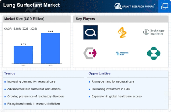 Innovations in pharmaceutical formulations are significantly influencing the Lung Surfactant Market. The development of new surfactant formulations, including synthetic and natural surfactants, enhances the efficacy and safety profiles of these products. Recent advancements have led to the introduction of more effective delivery systems, which improve patient outcomes. For instance, the emergence of aerosolized surfactants is gaining traction, as they offer a non-invasive method of administration. This evolution in formulation technology is anticipated to expand the market, with estimates suggesting a potential increase in market size by 20% over the next five years. Consequently, the Lung Surfactant Market is poised for substantial growth as these innovations become more widely adopted.