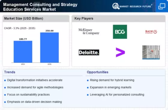 The Management Consulting and Strategy Education Services Market is characterized by a dynamic competitive landscape, driven by the increasing demand for strategic advisory services across various sectors. Key players such as McKinsey & Company (US), Boston Consulting Group (US), and Deloitte Consulting (US) are at the forefront, leveraging their extensive expertise to navigate complex business challenges. These firms are strategically positioned to capitalize on emerging trends, focusing on digital transformation, sustainability, and innovative solutions to enhance client value. Their collective strategies not only shape the competitive environment but also set benchmarks for operational excellence within the industry.In terms of business tactics, firms are increasingly localizing their services to better cater to regional markets, optimizing their supply chains to enhance efficiency. The competitive structure of the market appears moderately fragmented, with a mix of established players and niche consultancies vying for market share. The influence of key players is substantial, as they often dictate industry standards and best practices, thereby shaping the overall market dynamics.