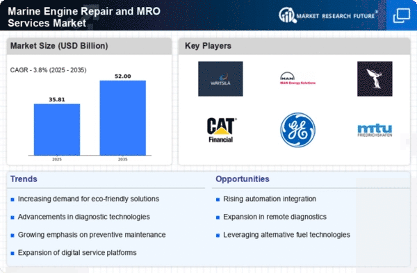The Marine Engine Repair and MRO Services Market is characterized by a competitive landscape that is increasingly shaped by technological advancements and strategic partnerships. Key players such as Wärtsilä (FI), MAN Energy Solutions (DE), and Rolls-Royce (GB) are actively pursuing innovation and digital transformation to enhance their service offerings. Wärtsilä, for instance, focuses on integrating smart technologies into its repair services, which not only improves efficiency but also aligns with the growing demand for sustainable practices. Meanwhile, MAN Energy Solutions emphasizes regional expansion, particularly in Asia, to capitalize on the burgeoning maritime sector in that region. These strategies collectively foster a dynamic environment where competition is not solely based on price but also on technological prowess and service reliability.In terms of business tactics, companies are increasingly localizing manufacturing and optimizing supply chains to enhance responsiveness to market demands. The competitive structure of the market appears moderately fragmented, with several players vying for market share. However, the influence of major companies like Caterpillar (US) and General Electric (US) remains substantial, as they leverage their extensive networks and resources to maintain a competitive edge. This collective influence shapes a market where agility and innovation are paramount, compelling smaller players to adapt or risk obsolescence.