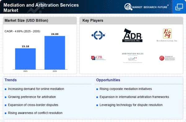 Europe's Mediation and Arbitration Services Market is valued at 4.5, reflecting a growing trend towards mediation as a preferred dispute resolution method. Factors such as increasing cross-border trade and regulatory frameworks promoting mediation are driving this growth. The European Union's emphasis on alternative dispute resolution has catalyzed demand, making mediation a vital component of the legal landscape across member states.