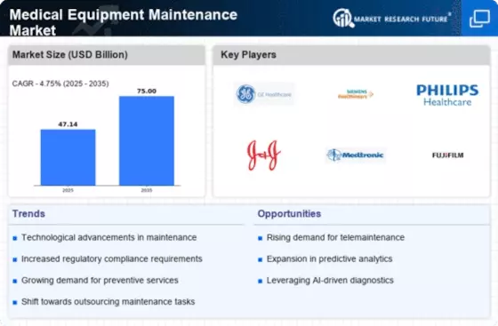 The Medical Equipment Maintenance Market is characterized by a dynamic competitive landscape, driven by technological advancements, increasing healthcare expenditures, and a growing emphasis on equipment reliability and longevity. Major players such as GE Healthcare (US), Siemens Healthineers (DE), and Philips Healthcare (NL) are strategically positioned to leverage innovation and digital transformation to enhance service offerings. These companies are focusing on integrating advanced analytics and IoT technologies into their maintenance services, which not only improves operational efficiency but also enhances customer satisfaction. The collective strategies of these key players contribute to a competitive environment that is increasingly centered around technological differentiation and service excellence.In terms of business tactics, companies are increasingly localizing manufacturing and optimizing supply chains to respond swiftly to market demands. The competitive structure of the Medical Equipment Maintenance Market appears moderately fragmented, with several players vying for market share. However, the influence of key players is substantial, as they set industry standards and drive innovation. This competitive interplay fosters an environment where smaller firms may struggle to keep pace with the rapid technological advancements and service expectations set by the larger entities.
