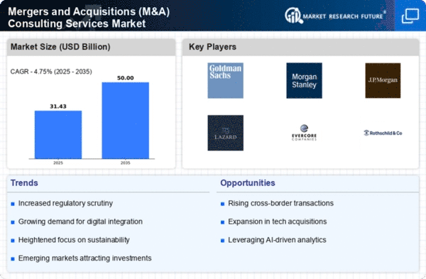 The competitive landscape is characterized by major players such as Goldman Sachs, Morgan Stanley, and J.P. Morgan, which dominate the market with their extensive expertise and resources. The U.S. remains the primary hub for M&A activities, supported by a strong legal framework and a culture of innovation. This environment fosters a continuous influx of deals, making North America a focal point for global M&A consulting services.