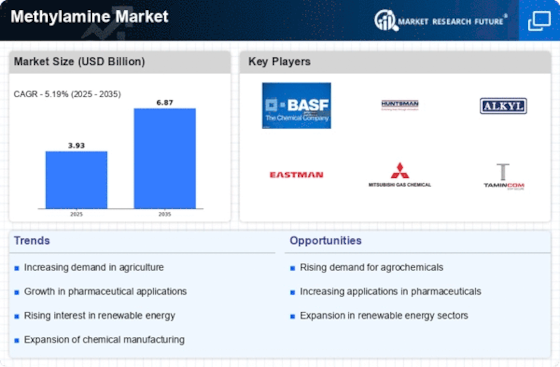 The Methylamine Market is poised for growth, driven by the expanding chemical manufacturing sector. Methylamine Market serves as a precursor for various chemicals, including solvents, surfactants, and pharmaceuticals. The chemical manufacturing industry has been on an upward trajectory, with a market size projected to exceed USD 5 trillion by 2025. This growth is attributed to increasing industrial activities and the rising demand for specialty chemicals. As manufacturers look to innovate and diversify their product offerings, the need for Methylamine Market as a versatile intermediate is likely to rise. Additionally, the integration of advanced manufacturing technologies may enhance production efficiency, further propelling the Methylamine Market forward. The interplay between chemical manufacturing and Methylamine Market utilization suggests a symbiotic relationship that could yield substantial opportunities for stakeholders.