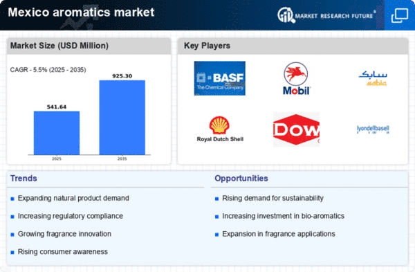 The aromatics market in Mexico is characterized by a competitive landscape that is increasingly shaped by innovation, sustainability, and strategic partnerships. Key players such as BASF SE (DE), ExxonMobil Chemical (US), and SABIC (SA) are actively pursuing strategies that emphasize technological advancements and regional expansion. BASF SE (DE) has focused on enhancing its production capabilities through digital transformation initiatives, while ExxonMobil Chemical (US) is leveraging its extensive supply chain to optimize operations and reduce costs. SABIC (SA) appears to be concentrating on sustainable practices, aligning its operations with global environmental standards, which collectively influences the competitive dynamics of the market.The market structure is moderately fragmented, with several players vying for market share. Key business tactics include localizing manufacturing to reduce logistics costs and optimizing supply chains to enhance efficiency. This competitive structure allows for a diverse range of products and services, fostering innovation and responsiveness to market demands. The collective influence of these major players is significant, as they drive trends that shape the market's future direction.