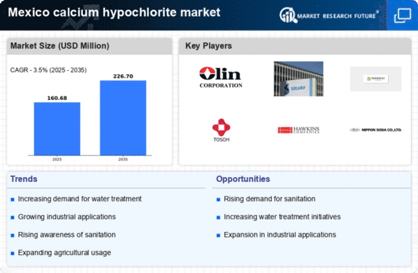 The calcium hypochlorite market in Mexico is characterized by a competitive landscape that is increasingly shaped by innovation, sustainability, and strategic partnerships. Key players such as Olin Corporation (US), Solvay S.A. (BE), and Hawkins, Inc. (US) are actively pursuing strategies that enhance their market positioning. Olin Corporation (US) focuses on expanding its production capabilities while investing in sustainable practices, which aligns with the growing demand for environmentally friendly products. Solvay S.A. (BE) emphasizes innovation in product development, particularly in applications for water treatment and sanitation, thereby enhancing its competitive edge. Hawkins, Inc. (US) is leveraging its extensive distribution network to optimize supply chain efficiencies, which is crucial in a market that is moderately fragmented yet competitive.The business tactics employed by these companies reflect a concerted effort to localize manufacturing and optimize supply chains. The market structure appears moderately fragmented, with several players vying for market share. However, the collective influence of major companies is significant, as they drive trends in product innovation and sustainability. This competitive dynamic fosters an environment where companies must continuously adapt to maintain their market positions.