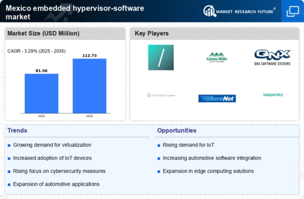 Investment in research and development (R&D) is a crucial driver for the embedded hypervisor-software market in Mexico. As companies strive to innovate and enhance their product offerings, R&D spending is expected to rise significantly. The Mexican government has been promoting initiatives to support technological advancements, which could lead to increased funding for software development. In 2025, R&D expenditure in the technology sector is projected to reach $1 billion, reflecting a commitment to fostering innovation. This influx of investment is likely to stimulate the embedded hypervisor-software market, as companies develop new solutions that meet the evolving needs of various industries, thereby enhancing competitiveness.