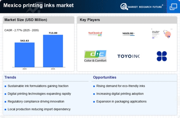 The printing inks market in Mexico is characterized by a dynamic competitive landscape, driven by innovation, sustainability, and regional expansion. Key players such as Sun Chemical (US), Flint Group (LU), and DIC Corporation (JP) are actively shaping the market through strategic initiatives. Sun Chemical (US) focuses on enhancing its product portfolio with eco-friendly inks, aligning with the growing demand for sustainable solutions. Meanwhile, Flint Group (LU) emphasizes digital transformation, investing in advanced technologies to streamline production processes and improve product quality. DIC Corporation (JP) is also pursuing regional expansion, establishing new manufacturing facilities to cater to the increasing demand in Latin America, thereby enhancing its competitive positioning.The business tactics employed by these companies reflect a concerted effort to optimize supply chains and localize manufacturing. The market structure appears moderately fragmented, with several players vying for market share. However, the collective influence of major companies like Sun Chemical (US) and Flint Group (LU) suggests a trend towards consolidation, as these firms leverage their resources to enhance operational efficiencies and meet evolving customer needs.
