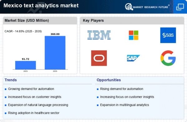 The text analytics market in Mexico is experiencing a notable surge due to the increasing demand for competitive intelligence among businesses. Companies are leveraging text analytics tools to extract insights from unstructured data, enabling them to understand market trends and consumer preferences. This trend is particularly pronounced in sectors such as retail and finance, where organizations are seeking to gain an edge over competitors. According to recent estimates, the market for text analytics in Mexico is projected to grow at a CAGR of approximately 15% over the next five years. This growth is driven by the need for real-time data analysis and the ability to make informed decisions based on customer feedback and market dynamics. As businesses recognize the value of text analytics, investment in these technologies is likely to increase, further propelling the industry forward.