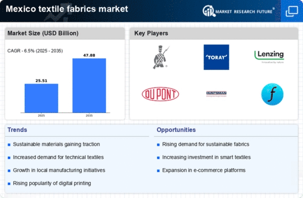 The textile fabrics market in Mexico is characterized by a dynamic competitive landscape, driven by factors such as increasing consumer demand for sustainable materials, technological advancements, and a growing emphasis on digital transformation. Major players like Berkshire Hathaway (US), Toray Industries (JP), and DuPont (US) are strategically positioned to leverage these trends. Berkshire Hathaway (US) focuses on innovation through its diverse portfolio, which includes investments in sustainable textile technologies. Meanwhile, Toray Industries (JP) emphasizes regional expansion and partnerships to enhance its market presence, particularly in eco-friendly fabric production. DuPont (US) is actively pursuing digital transformation initiatives to optimize its supply chain and improve product offerings, thereby shaping a competitive environment that prioritizes sustainability and technological integration.Key business tactics within the market include localizing manufacturing and optimizing supply chains to enhance efficiency and responsiveness to consumer needs. The competitive structure appears moderately fragmented, with a mix of large multinational corporations and smaller, specialized firms. This fragmentation allows for a variety of offerings, yet the influence of key players remains substantial, as they set trends and standards that smaller companies often follow.