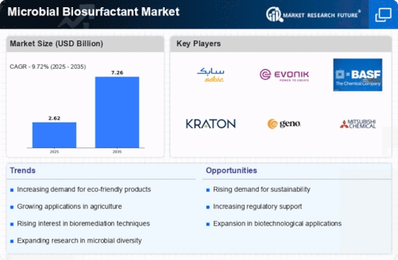 Consumer awareness regarding environmental issues is a significant driver for the Microbial Biosurfactant Market. As consumers become more informed about the impact of chemical surfactants on health and the environment, there is a growing demand for natural and biodegradable alternatives. This shift in consumer preference is prompting manufacturers to reformulate products using microbial biosurfactants, particularly in personal care and household cleaning sectors. Market Research Future indicates that products labeled as eco-friendly are increasingly favored by consumers, leading to a rise in sales for brands that prioritize sustainability. This trend is expected to continue, with projections suggesting that the demand for microbial biosurfactants could increase by 20% over the next five years. The heightened consumer focus on sustainability is likely to drive innovation and expansion within the Microbial Biosurfactant Market.