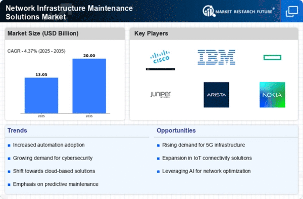 The Network Infrastructure Maintenance Solutions Market is characterized by a dynamic competitive landscape, driven by the increasing demand for robust and reliable network systems. Key players are focusing on innovation, strategic partnerships, and regional expansion to enhance their market presence. Companies such as Cisco Systems (US), IBM (US), and Huawei Technologies (CN) are at the forefront, leveraging their technological expertise to offer comprehensive solutions. Cisco Systems (US) emphasizes digital transformation and cloud-based services, while IBM (US) integrates AI and analytics into its offerings. Huawei Technologies (CN) continues to expand its global footprint, particularly in emerging markets, thereby intensifying competition among these major players.The market structure appears moderately fragmented, with several key players vying for market share. Business tactics such as localizing manufacturing and optimizing supply chains are prevalent among these companies, allowing them to respond swiftly to regional demands. The collective influence of these players shapes the competitive environment, as they strive to differentiate themselves through technological advancements and customer-centric solutions.