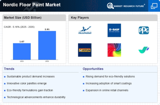 The Nordic Floor Paint Market is increasingly influenced by a growing emphasis on sustainability. Consumers are becoming more environmentally conscious, leading to a demand for eco-friendly paint options. This trend is reflected in the rising popularity of water-based paints, which are less harmful to the environment compared to traditional solvent-based alternatives. In 2025, it is estimated that the market for sustainable floor paints will account for a significant portion of overall sales, driven by regulations promoting low-VOC products. Manufacturers are responding by innovating formulations that meet these standards while maintaining performance. This shift not only caters to consumer preferences but also aligns with broader environmental goals, suggesting that sustainability will continue to be a pivotal driver in the Nordic Floor Paint Market.