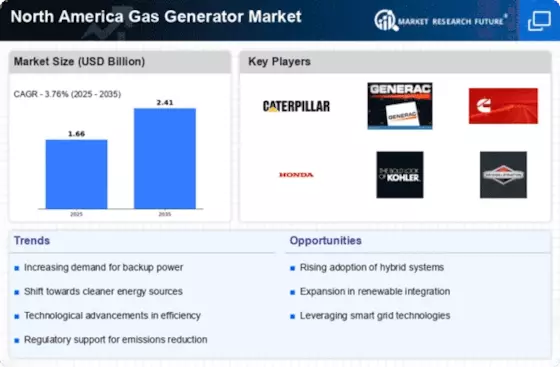 The North America Gas Generator Market is witnessing significant advancements in technology that enhance the efficiency and performance of gas generators. Innovations such as improved engine designs, advanced control systems, and fuel management technologies are contributing to higher efficiency rates and lower emissions. For instance, modern gas generators are now capable of achieving efficiency levels exceeding 40%, which is a substantial improvement over older models. These technological enhancements not only reduce operational costs for users but also align with the growing emphasis on sustainability and environmental responsibility. As businesses and consumers become more aware of the benefits of energy-efficient solutions, the demand for technologically advanced gas generators is expected to surge, further propelling the North America Gas Generator Market.