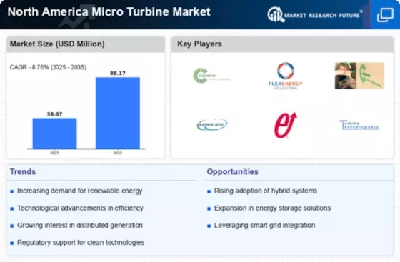 The North America Micro Turbine Market is characterized by a competitive landscape that is increasingly shaped by innovation, sustainability, and strategic partnerships. Key players such as Capstone Turbine Corporation (US), FlexEnergy (US), and Ingersoll Rand (US) are actively pursuing strategies that emphasize technological advancements and market expansion. Capstone Turbine Corporation (US) focuses on enhancing its product offerings through continuous innovation, while FlexEnergy (US) is leveraging its expertise in waste heat recovery to capture a growing segment of the market. Ingersoll Rand (US) appears to be concentrating on integrating digital solutions into its operations, thereby enhancing efficiency and customer engagement. Collectively, these strategies contribute to a dynamic competitive environment where differentiation is increasingly reliant on technological prowess and sustainability initiatives.