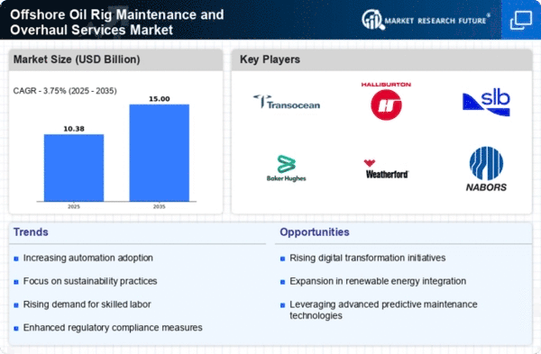 The Middle East and Africa region is gradually developing its Offshore Oil Rig Maintenance and Overhaul Services Market, currently valued at 0.7 in 2024. The growth is primarily driven by the region's rich oil reserves and increasing offshore exploration activities. Regulatory frameworks are evolving to support sustainable practices, which is crucial for attracting foreign investments in maintenance services.