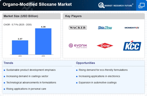 The Organo-Modified Siloxane Market is increasingly aligning with sustainability initiatives as consumers and businesses prioritize eco-friendly products. The demand for sustainable materials is driving innovation in the development of organo-modified siloxanes that are less harmful to the environment. This shift is evident in various sectors, including construction and automotive, where there is a growing emphasis on reducing carbon footprints. Companies are investing in research to create organo-modified siloxanes that meet stringent environmental regulations while maintaining performance standards. This focus on sustainability is likely to enhance the market's appeal, attracting environmentally conscious consumers and businesses alike.