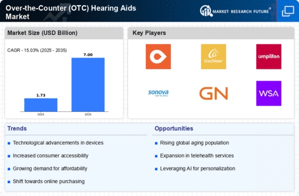 North America is poised to maintain its leadership in the OTC hearing aids market, holding a significant 75% market share as of 2024. Key growth drivers include an aging population, increased awareness of hearing health, and favorable regulatory changes that facilitate easier access to hearing aids. The demand for affordable and user-friendly devices is also on the rise, supported by technological advancements and consumer preference for over-the-counter solutions. The competitive landscape is robust, with major players like Eargo, Starkey Hearing Technologies, and Hearing Life leading the charge. The U.S. is the primary market, benefiting from a well-established healthcare infrastructure and a high level of consumer spending. Companies are increasingly focusing on innovation and marketing strategies to capture the growing demand, ensuring a dynamic and competitive environment.