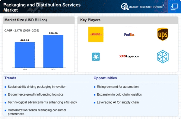 The Packaging and Distribution Services Market is characterized by a dynamic competitive landscape, driven by factors such as globalization, e-commerce growth, and technological advancements. Major players like DHL (DE), FedEx (US), and UPS (US) are strategically positioned to leverage these trends. DHL (DE) focuses on sustainability initiatives, aiming to achieve net-zero emissions by 2050, which aligns with increasing consumer demand for environmentally friendly practices. FedEx (US) emphasizes digital transformation, investing heavily in automation and AI to enhance operational efficiency and customer experience. UPS (US) is expanding its logistics network through strategic partnerships, enhancing its service offerings and geographic reach, thereby shaping a competitive environment that prioritizes innovation and responsiveness.Key business tactics within the market include localizing manufacturing and optimizing supply chains to enhance efficiency and reduce costs. The competitive structure appears moderately fragmented, with a mix of large multinational corporations and regional players. The collective influence of key players fosters a competitive atmosphere where agility and adaptability are paramount, as companies strive to meet the evolving demands of consumers and businesses alike.