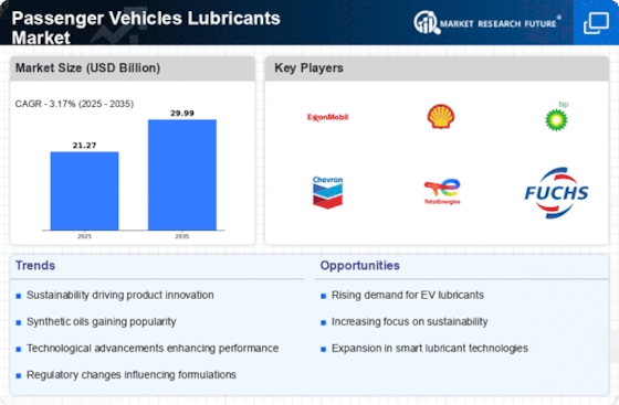 The stringent regulatory environment surrounding emissions and fuel efficiency is a significant driver for the Passenger Vehicles Lubricants Market. Governments worldwide are implementing regulations that mandate lower emissions and improved fuel economy, compelling manufacturers to develop lubricants that meet these standards. For instance, the introduction of new API (American Petroleum Institute) standards has prompted lubricant producers to innovate and create products that not only comply with regulations but also enhance vehicle performance. This regulatory pressure is expected to continue, pushing the industry towards the development of eco-friendly and high-performance lubricants. Consequently, the Passenger Vehicles Lubricants Market is likely to experience growth as manufacturers adapt to these evolving standards.