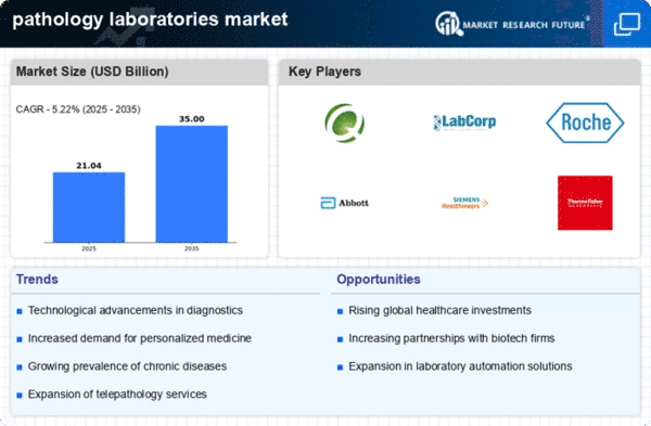 The pathology laboratories market is characterized by a dynamic competitive landscape, driven by technological advancements, increasing demand for diagnostic services, and a growing emphasis on personalized medicine. Major players such as Quest Diagnostics (US), Laboratory Corporation of America (US), and Roche Diagnostics (CH) are at the forefront, each adopting distinct strategies to enhance their market positioning. Quest Diagnostics (US) focuses on expanding its test menu and enhancing patient access through digital platforms, while Laboratory Corporation of America (US) emphasizes strategic acquisitions to bolster its capabilities in genetic testing. Roche Diagnostics (CH) is heavily investing in research and development to innovate its diagnostic solutions, thereby reinforcing its competitive edge.The business tactics employed by these companies include localizing manufacturing to reduce costs and optimize supply chains, which is particularly crucial in a moderately fragmented market. The collective influence of these key players shapes a competitive structure that encourages innovation and responsiveness to market demands, fostering an environment where agility and adaptability are paramount.
