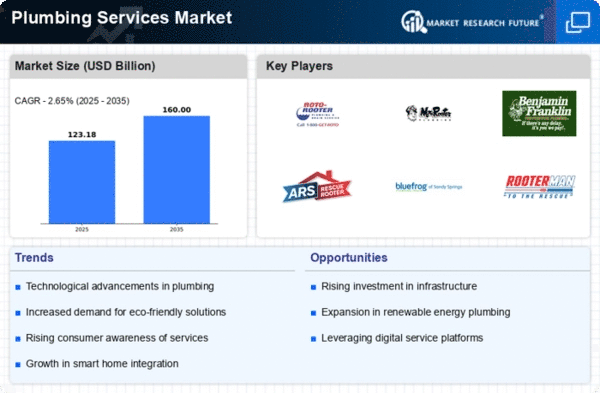 The Plumbing Services Market is characterized by a competitive landscape that is increasingly shaped by innovation, digital transformation, and strategic partnerships. Key players such as Roto-Rooter (US), Mr. Rooter (US), and Benjamin Franklin Plumbing (US) are actively pursuing strategies that enhance their operational efficiency and customer engagement. Roto-Rooter (US) has focused on expanding its service offerings through technological advancements, while Mr. Rooter (US) emphasizes customer service excellence and local market penetration. Benjamin Franklin Plumbing (US) appears to be leveraging its brand reputation to foster customer loyalty, which collectively influences the competitive dynamics of the market.The business tactics employed by these companies include optimizing supply chains and localizing service delivery to meet regional demands. The market structure is moderately fragmented, with a mix of large national players and smaller local firms. This fragmentation allows for diverse service offerings, yet the collective influence of major players like ARS Rescue Rooter (US) and Bluefrog Plumbing + Drain (US) is significant, as they set benchmarks for service quality and operational standards.
