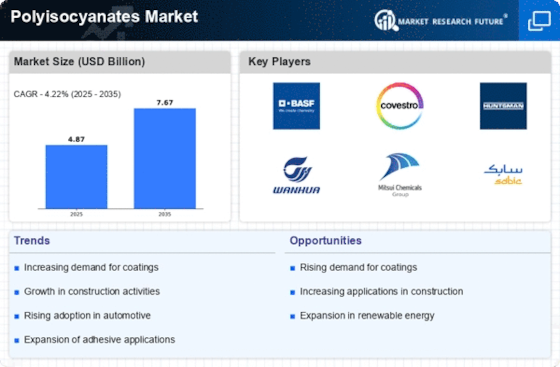 The automotive industry is a significant driver for the polyisocyanates market, as these compounds are extensively used in the production of coatings, adhesives, and sealants. With the automotive sector's ongoing evolution towards lightweight materials and enhanced durability, polyisocyanates are becoming increasingly favored. The market for automotive coatings, which includes polyisocyanate-based products, is expected to grow at a rate of around 4% annually. This growth is attributed to the rising demand for high-performance coatings that offer superior protection and aesthetic appeal. As automotive manufacturers continue to innovate, the polyisocyanates market is likely to benefit from the increasing adoption of these materials in vehicle production.