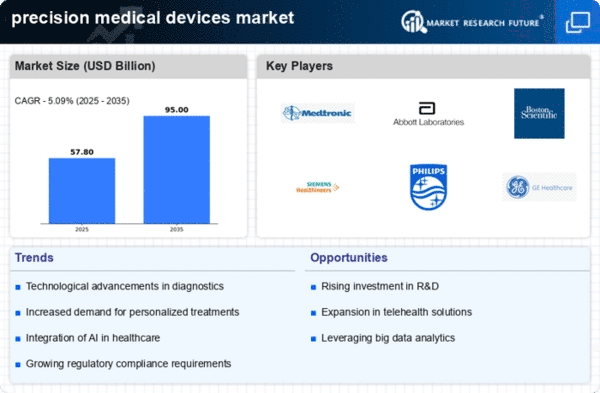 The precision medical devices market is characterized by a dynamic competitive landscape, driven by technological advancements, increasing healthcare demands, and a growing emphasis on personalized medicine. Major players such as Medtronic (US), Abbott (US), and Siemens Healthineers (DE) are strategically positioned to leverage innovation and expand their market presence. Medtronic (US) focuses on enhancing its product portfolio through continuous innovation, particularly in minimally invasive surgical devices, while Abbott (US) emphasizes its strength in diagnostics and cardiovascular devices. Siemens Healthineers (DE) is investing heavily in digital health solutions, indicating a shift towards integrated healthcare systems.