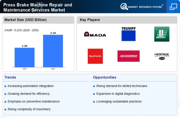 The Press Brake Machine Repair and Maintenance Services Market is characterized by a competitive landscape that is increasingly shaped by technological advancements and strategic partnerships. Key players such as Amada (Japan), Trumpf (Germany), and LVD (Belgium) are actively pursuing innovation and digital transformation to enhance their service offerings. Amada (Japan) has focused on integrating advanced automation technologies into its repair services, which not only improves efficiency but also reduces downtime for clients. Meanwhile, Trumpf (Germany) emphasizes sustainability in its operations, aligning its maintenance services with eco-friendly practices, thereby appealing to a growing segment of environmentally conscious manufacturers. Collectively, these strategies indicate a shift towards a more integrated and technologically advanced service model within the market.The business tactics employed by these companies reflect a nuanced understanding of the market's structure, which is moderately fragmented yet increasingly competitive. Localizing manufacturing and optimizing supply chains are pivotal strategies that enhance responsiveness to regional demands. This localized approach allows companies to tailor their services more effectively, thereby fostering stronger relationships with clients. The collective influence of these key players is significant, as they not only set industry standards but also drive innovation that reshapes customer expectations.