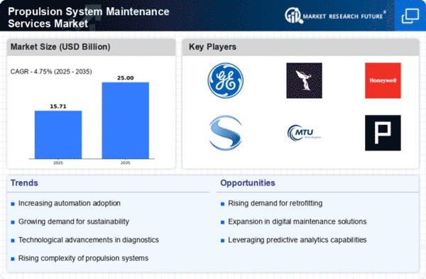 The Propulsion System Maintenance Services Market is characterized by a dynamic competitive landscape, driven by technological advancements and increasing demand for efficient and reliable propulsion systems. Key players such as General Electric (US), Rolls-Royce (GB), and Honeywell (US) are at the forefront, each adopting distinct strategies to enhance their market positioning. General Electric (US) emphasizes innovation through its digital solutions, focusing on predictive maintenance technologies that optimize operational efficiency. Meanwhile, Rolls-Royce (GB) has been actively pursuing strategic partnerships to bolster its service offerings, particularly in the realm of sustainable aviation. Honeywell (US) is leveraging its expertise in automation and data analytics to streamline maintenance processes, thereby enhancing customer satisfaction and operational reliability. Collectively, these strategies contribute to a competitive environment that is increasingly focused on technological integration and service excellence.In terms of business tactics, companies are localizing manufacturing and optimizing supply chains to enhance responsiveness to market demands. The market structure appears moderately fragmented, with several key players exerting influence while also facing competition from emerging firms. This fragmentation allows for a diverse range of service offerings, catering to various customer needs and preferences. The collective influence of these major players shapes the market dynamics, fostering an environment where innovation and customer-centric strategies are paramount.