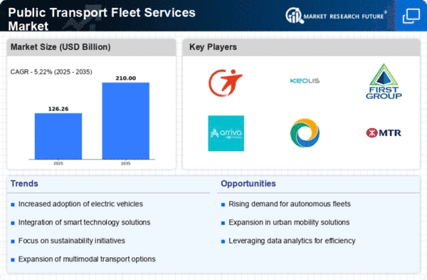 The Public Transport Fleet Services Market is characterized by a dynamic competitive landscape, driven by increasing urbanization, a growing emphasis on sustainability, and the need for efficient public transportation solutions. Key players such as Transdev (FR), Keolis (FR), and FirstGroup (GB) are actively shaping the market through strategic initiatives that focus on innovation and regional expansion. Transdev (FR) has positioned itself as a leader in sustainable transport solutions, emphasizing electric and hybrid vehicles in its fleet. Meanwhile, Keolis (FR) has been enhancing its digital transformation efforts, integrating advanced technologies to improve operational efficiency and customer experience. FirstGroup (GB) is also focusing on expanding its service offerings, particularly in the UK, to capture a larger market share, thereby intensifying competition among these major players.The market structure appears moderately fragmented, with numerous players competing for market share. Key business tactics include localizing manufacturing and optimizing supply chains to enhance service delivery. The collective influence of these major companies is significant, as they not only drive innovation but also set benchmarks for operational excellence within the industry. Their strategies often involve partnerships with technology firms to leverage digital solutions, which further complicates the competitive dynamics.