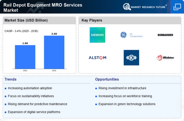 The Rail Depot Equipment MRO Services Market is characterized by a competitive landscape that is increasingly shaped by technological advancements and strategic collaborations. Key players such as Siemens (DE), GE Transportation (US), and Alstom (FR) are actively pursuing innovation and digital transformation to enhance operational efficiency and service delivery. Siemens (DE) has positioned itself as a leader in digital solutions, focusing on integrating IoT technologies into maintenance processes, which appears to streamline operations and reduce downtime. Meanwhile, GE Transportation (US) emphasizes partnerships with local rail operators to optimize supply chains and enhance service offerings, thereby strengthening its market presence. Alstom (FR) is also notable for its commitment to sustainability, investing in eco-friendly technologies that align with global environmental goals, which collectively shapes a competitive environment that prioritizes innovation and sustainability.The market structure is moderately fragmented, with several players vying for market share through localized manufacturing and supply chain optimization. This fragmentation allows for a diverse range of services and solutions, catering to various regional needs. The collective influence of these key players fosters a dynamic competitive atmosphere, where agility and responsiveness to market demands are crucial for success.