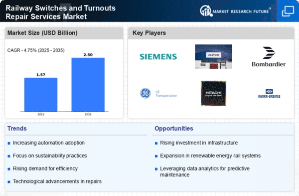 The Railway Switches and Turnouts Repair Services Market is characterized by a competitive landscape that is increasingly shaped by technological advancements and strategic collaborations. Key growth drivers include the rising demand for efficient rail infrastructure, the need for modernization of existing systems, and the push towards sustainability. Major players such as Siemens AG (DE), Alstom SA (FR), and Bombardier Inc (CA) are actively positioning themselves through innovation and strategic partnerships. Siemens AG (DE) focuses on digital transformation and smart rail solutions, while Alstom SA (FR) emphasizes sustainability and green technologies. Bombardier Inc (CA) is enhancing its service offerings through mergers and acquisitions, thereby strengthening its market presence. Collectively, these strategies contribute to a dynamic competitive environment where companies are vying for leadership through technological prowess and operational excellence.In terms of business tactics, companies are increasingly localizing manufacturing to reduce costs and enhance supply chain efficiency. This approach not only mitigates risks associated with The Railway Switches and Turnouts Repair Services demands. The market structure appears moderately fragmented, with several key players holding substantial market shares. The collective influence of these companies fosters a competitive atmosphere where innovation and service quality are paramount, as firms strive to differentiate themselves in a crowded marketplace.